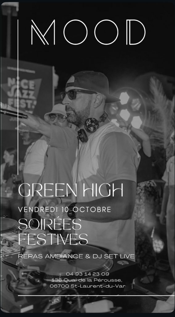 Ambiance assurée ce vendredi 🎧🎹🎤Posted on 6 octobre 2025 by Mood_2020_MJCSP in News No Comments SHARE Facebook FacebookTwitter TwitterGoogle Plus Pinterest GREEN HIGH VENDREDI 10 OCTOBRE SOIRÉES FESTIVES REPAS AMBIANCE & DJ SET LIVE 04 93 14 23 09 136 Quai de la Pérousse, 06700 St-Laurent-du-Var SHARE Facebook FacebookTwitter TwitterGoogle Plus Pinterest Navigation de l’article Previous PostPrevious une fraîcheur et une saveur incomparable 👌Next PostNext Au MOOD, plus qu’une équipe : une grande famille ❣️